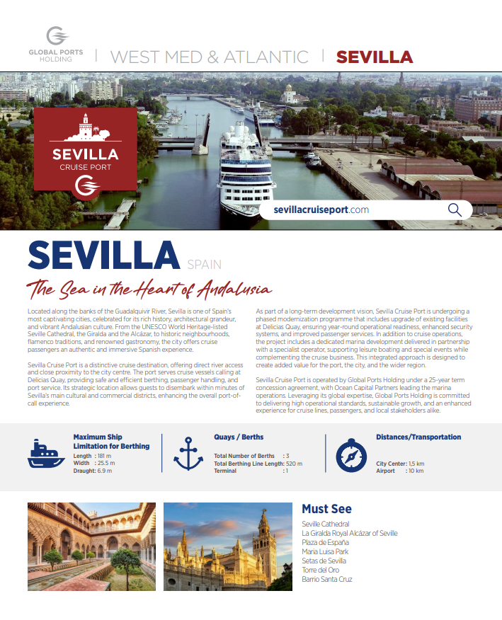 The Sevilla Cruise Port Terminal is located at Muelle de las Delicias, s/n, Port of Sevilla, C.P. 41012, Sevilla, which is within walking distance of the city center.